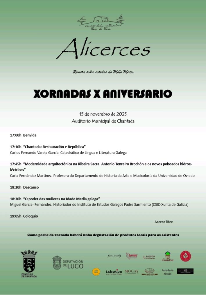 Dentro de las Xornadas X Aniversario de «Alícerces. Revista sobre estudios de Miño Media», el 15 de noviembre, la profesora Carla Fernández ofrecerá una ponencia titulada «Modernidade arquitectónica na Ribeira Sacra. Antonio Tenreiro Brochón e os novos poboados hidroeléctricos». Será a las 17.45 horas en en el Auditorio Municipal de Chantada (Lugo). Acceso libre.
